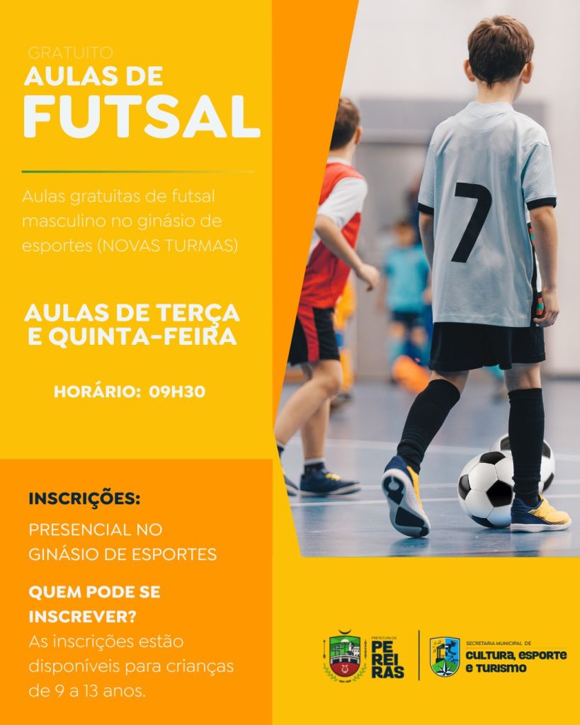 A Prefeitura, por meio da Secretaria de Cultura, Esporte e Turismo, abriu inscrições para aulas gratuitas de futsal masculino, voltadas a crianças de 9 a 13 anos. As atividades acontecem no Ginásio de Esportes, às terças e quintas, a partir das 9h30.