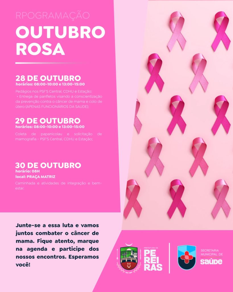 Informação e prevenção são as maiores armas no combate ao câncer de mama. Nos dias 28, 29 e 30 de outubro, participe das ações especiais promovidas pela Secretaria Municipal de Saúde!