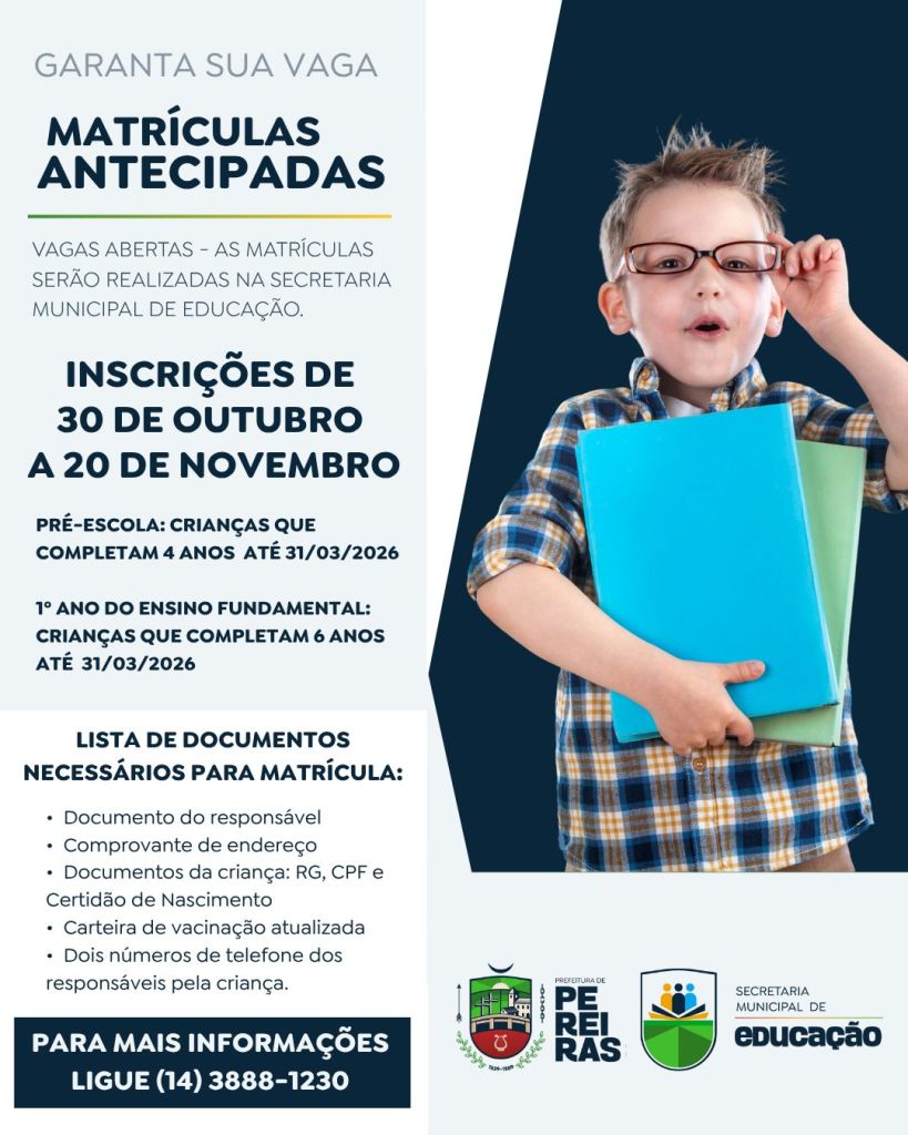 Garanta a vaga do seu filho nas escolas municipais de Pereiras para o próximo ano letivo. Fique atento aos prazos e procure a unidade escolar para atualizar os dados e confirmar a matrícula.