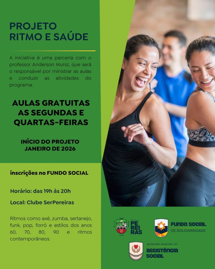 Ritmo e Saúde é mais uma iniciativa da Prefeitura de Pereiras voltada à promoção do bem-estar, da saúde e da convivência social por meio da dança. O projeto é aberto para pessoas a partir de 15 anos!