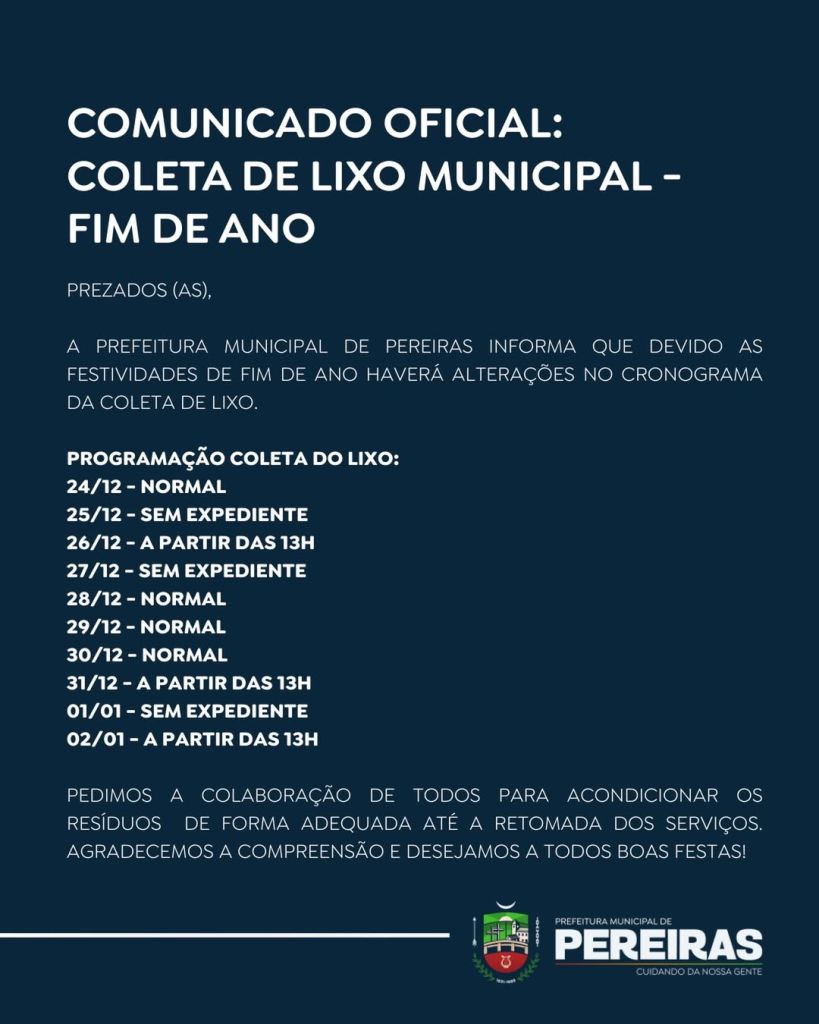Em razão das festividades de fim de ano, a coleta de lixo em Pereiras terá alterações em alguns dias.