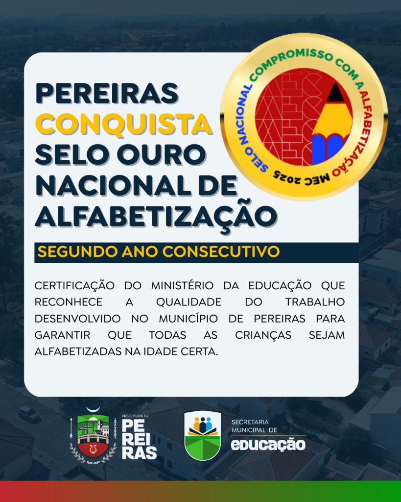 Pereiras conquistou, pelo segundo ano consecutivo, o Selo Ouro 2025, na 2ª edição do Selo Nacional de Compromisso com a Alfabetização, concedido pelo Ministério da Educação (MEC).