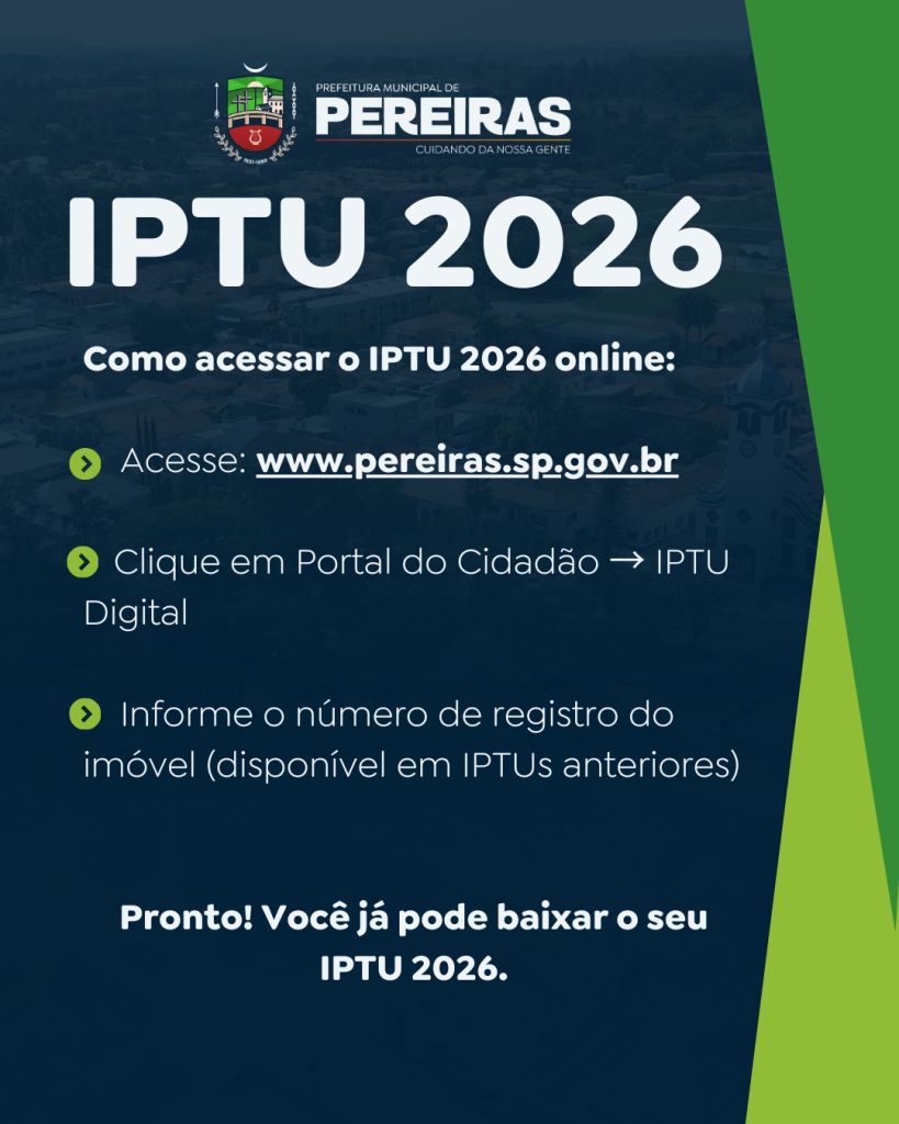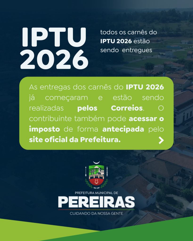 As entregas dos carnês do IPTU 2026 já tiveram início e estão sendo realizadas pelos Correios. O contribuinte também pode acessar o imposto de forma antecipada pelo site oficial da Prefeitura.