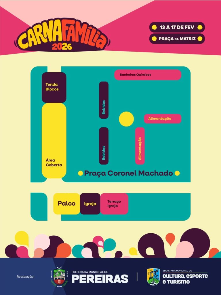 Sua única preocupação neste carnaval deve ser a diversão! Por isso, para 2026, reformulamos a estrutura na Praça Coronel Machado. O novo layout foi planejado para garantir: