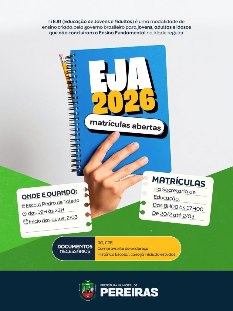 A Prefeitura de Pereiras informa que estão abertas as matrículas para a Educação de Jovens e Adultos (EJA) 2026. A modalidade é destinada a pessoas que desejam retomar os estudos e concluir o Ensino Fundamental.