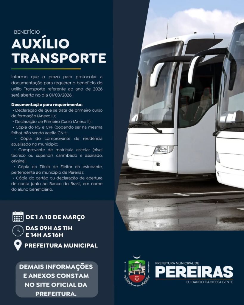 A Prefeitura de Pereiras informa que está aberto, desde o dia 2 de março de 2026, o prazo para protocolo da documentação necessária para solicitação do Auxílio Transporte Universitário referente ao ano de 2026.