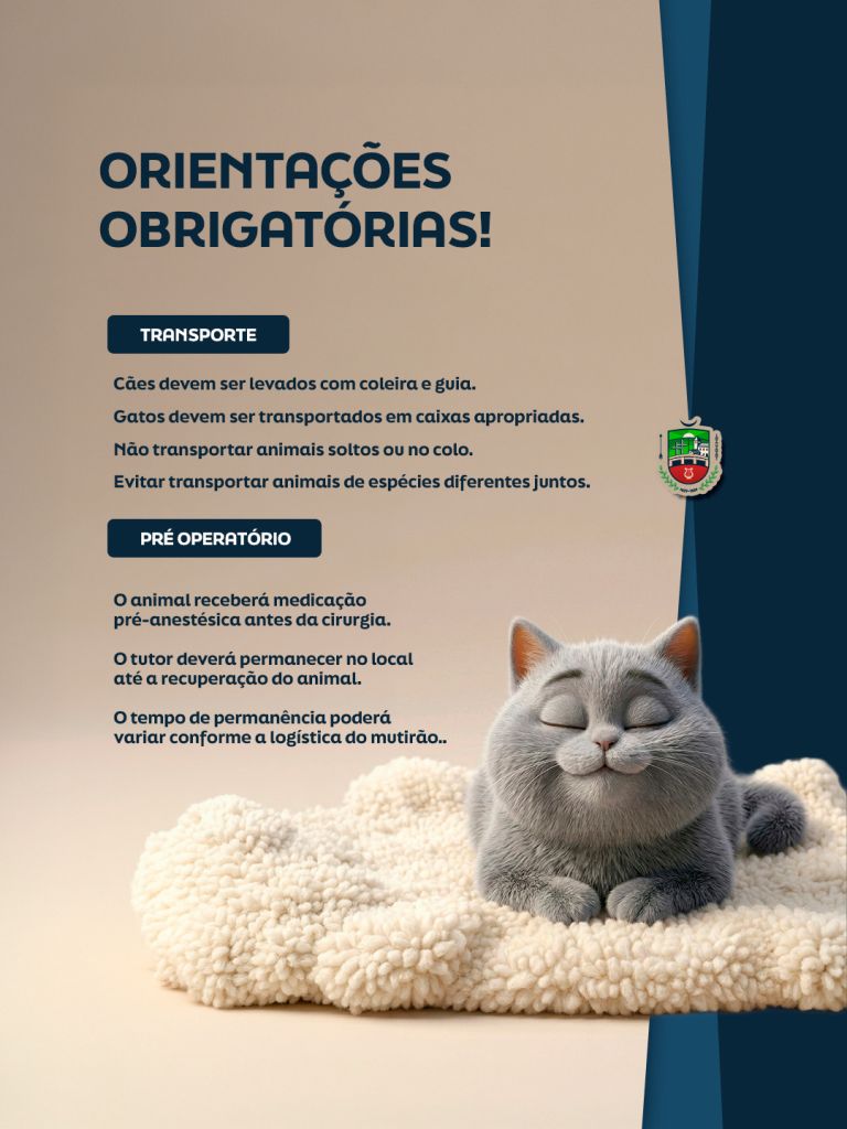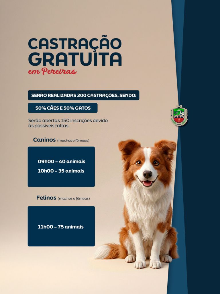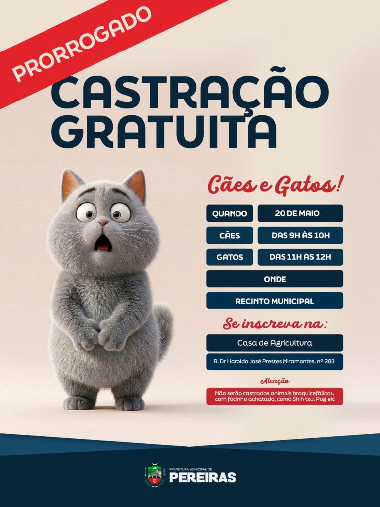 A Prefeitura de Pereiras informa que a ação de castração gratuita de cães e gatos foi prorrogada e já conta com nova programação. O mutirão será realizado no dia 20 de maio, no Recinto Municipal.