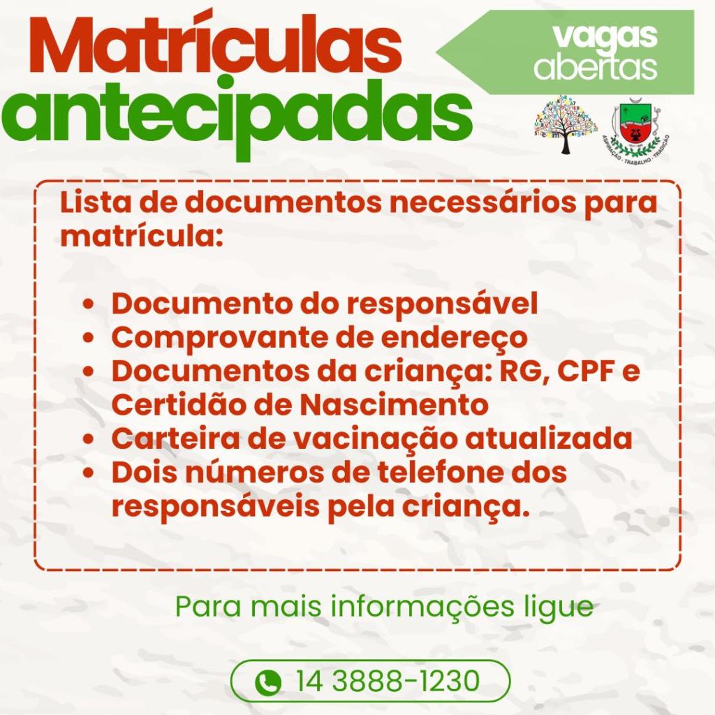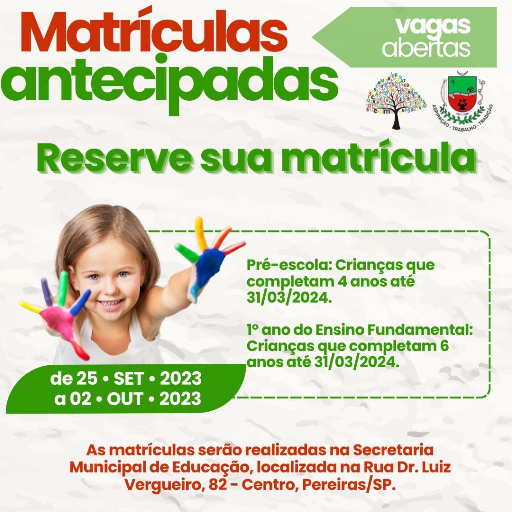 A partir do dia 25 de setembro de 2023 a 02 de outubro de 2023, as matrículas antecipadas estarão abertas.