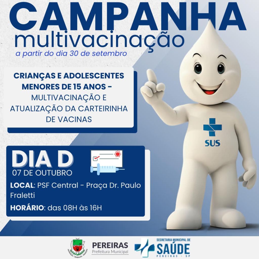 A Secretaria Municipal de Pereiras informa que a Campanha de Multivacinação para crianças e adolescentes, com idade até 15 anos, terá início em 30/09/2023.