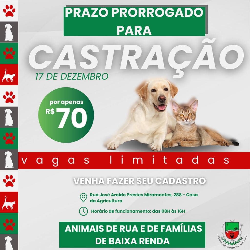 A campanha é uma iniciativa da Casa da Agricultura com apoio da Prefeitura Municipal para tornar a castração acessível a um custo de R$70,00. No entanto, as vagas são limitadas, portanto não perca tempo e garanta sua participação.