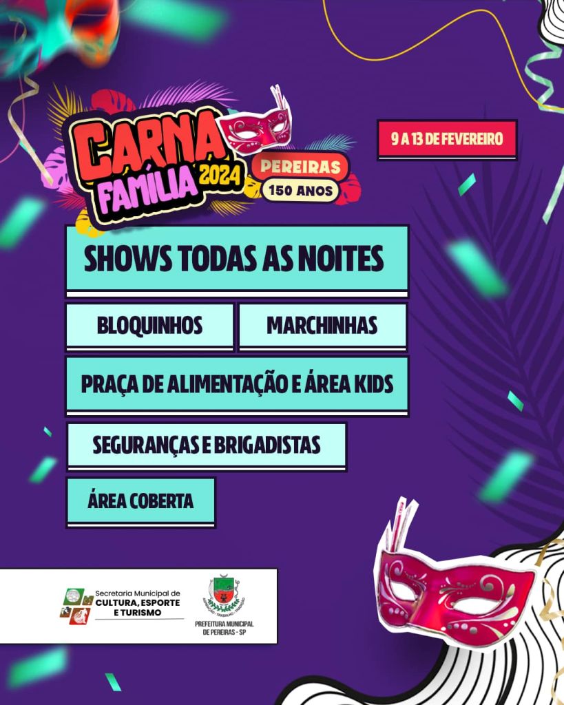 Nosso Carnafamilia 2024 está chegando para agitar nossa cidade com estrutura completa, show todas as noites, praça de alimentação, área kids, segurança e muito mais!