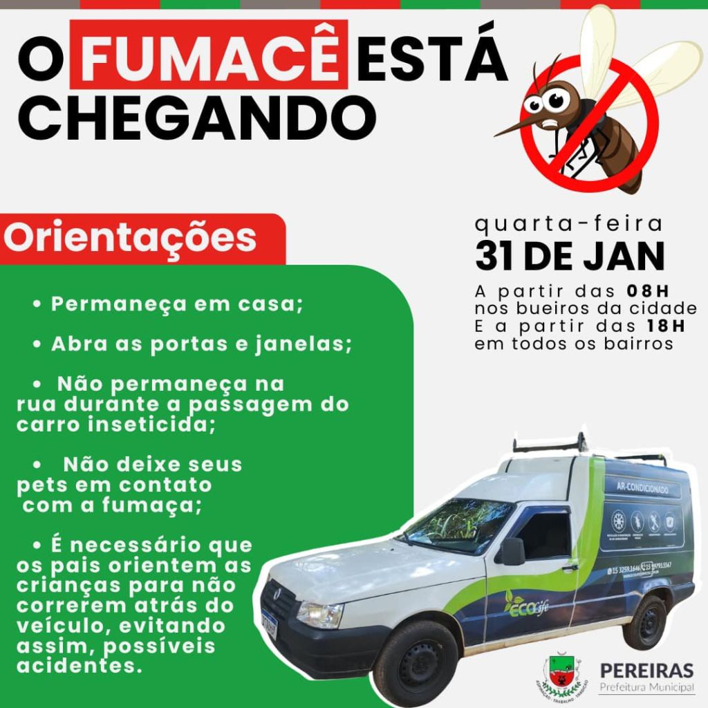 No dia 31/01, o fumacê estará em ação nos bueiros da cidade às 08h e, posteriormente, às 18h, percorrendo todos os bairros.