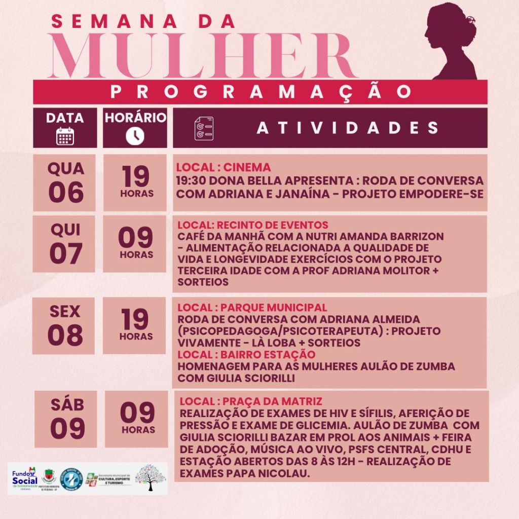Nessa semana, de 06 a 09 de Março, nossa cidade terá uma programação especial recheada de ações para nossas mulheres!