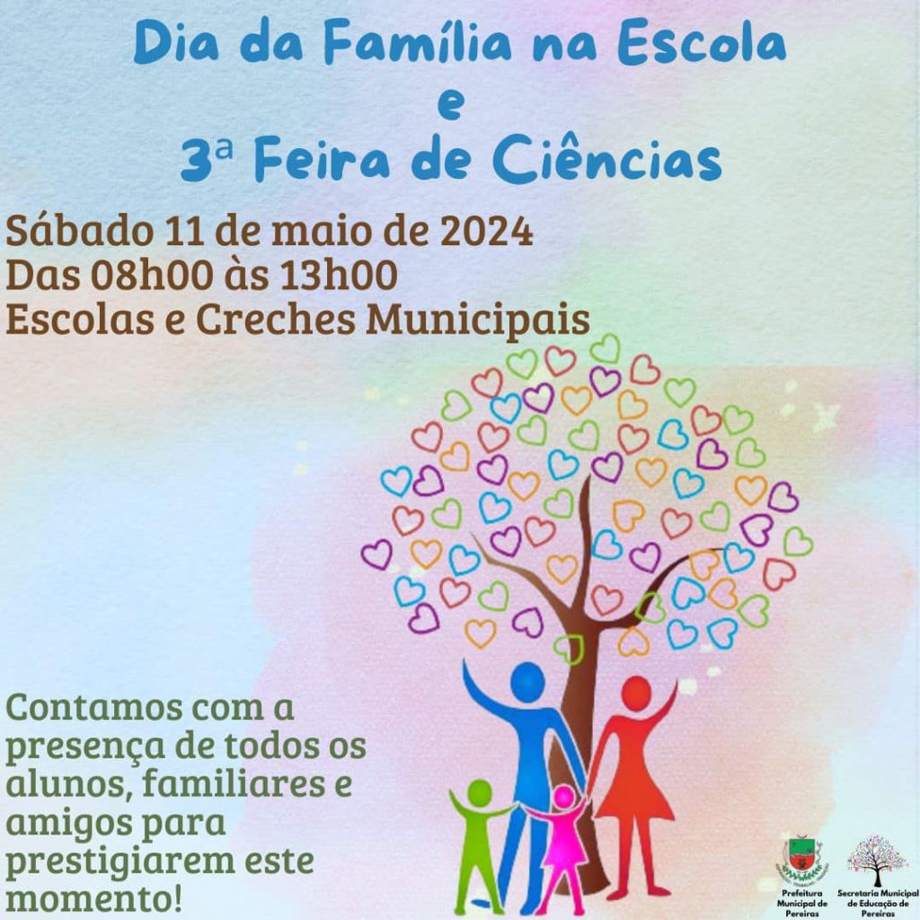 Junte-se a nós neste sábado (11/05) para a 3ª Feira de Ciências nas Escolas e Creches Municipais, além do Dia da Família! Faça parte deste momento especial na vida das nossas crianças e crie memórias inesquecíveis!