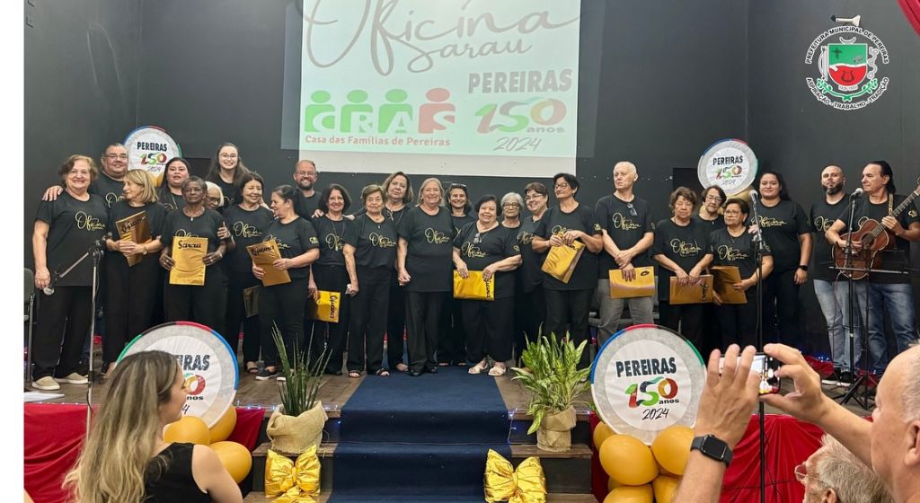 Na última sexta-feira (18/10), foi realizada no Cine São Roque, a Oficina Sarau, promovida pelo CRAS com o apoio da Secretaria de Assistencia Social e de Cultura. O evento, aberto ao público, contou com a participação de autoridades, famíliares e municípes. Os idosos que fazem parte da Oficina da Memória que ocorre quinzenalmente as quartas-feiras recitaram poemas, canções e compartilharam declarações de amor por Pereiras. Além de celebrar a cidade, o projeto destacou a cultura local com declamações de autores e homenagens a figuras importantes da nossa história. Viva Pereiras, 150 anos!