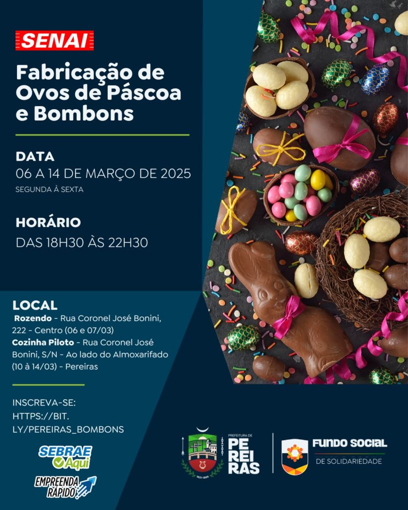 O Sebrae, em parceria com a Prefeitura de Pereiras e o Fundo Social, traz para você um curso gratuito para aprender a produzir deliciosos ovos de Páscoa e bombons! Além de desenvolver suas habilidades, essa é uma ótima oportunidade para gerar renda extra.