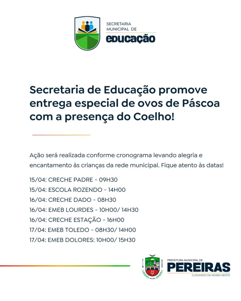 A Secretaria de Educação preparou uma entrega especial de ovos de Páscoa com a presença do Coelho, levando alegria e carinho para nossas crianças.