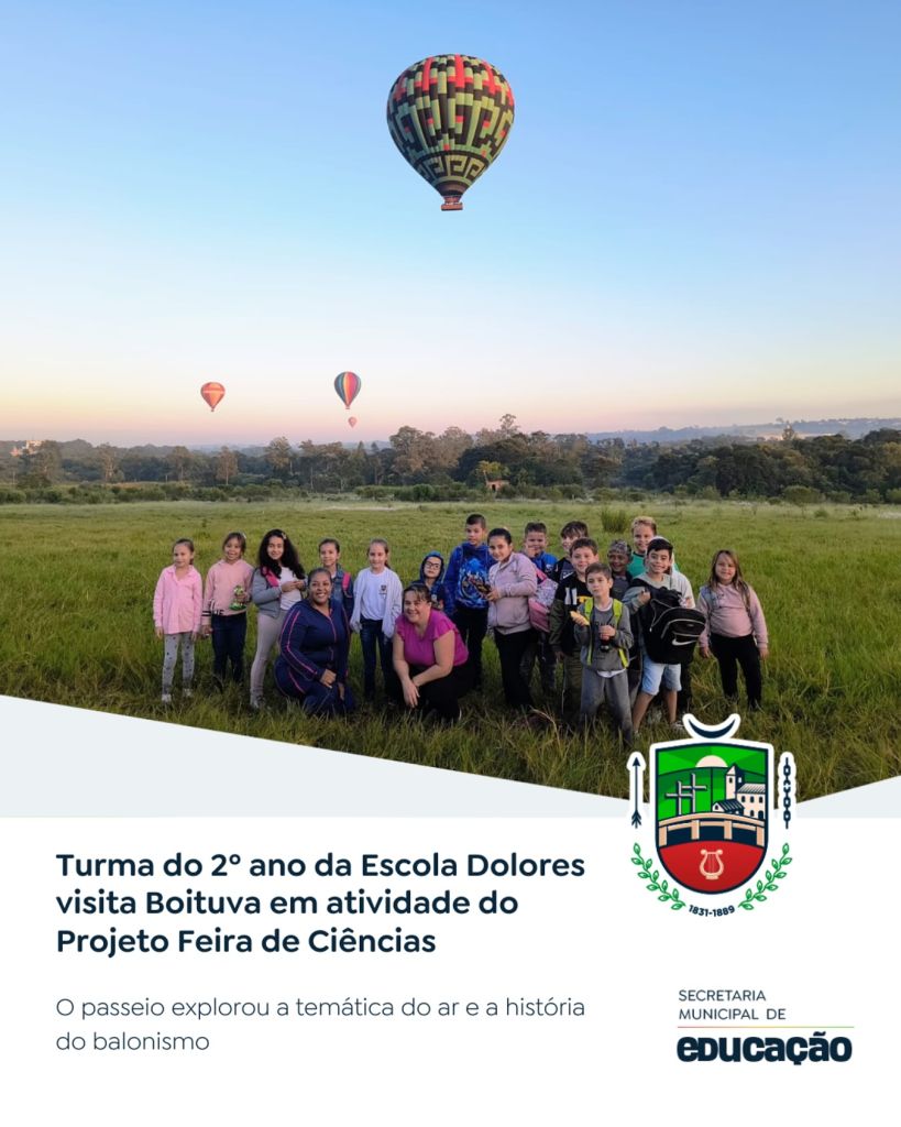 A turma do 2º ano A da Escola Dolores, sob coordenação da professora Noemi, realizou no início uma visita à cidade de Boituva como parte do desenvolvimento do Projeto Feira de Ciências, que será apresentado no dia 10 de maio. O tema escolhido pela turma é “O Ar”, com foco no funcionamento dos balões e o motivo pelo qual eles flutuam. Durante a visita, os alunos aprenderam sobre o processo físico que permite o voo dos balões e conheceram mais sobre a história e evolução do balonismo, aprofundando o conteúdo de forma lúdica e prática.