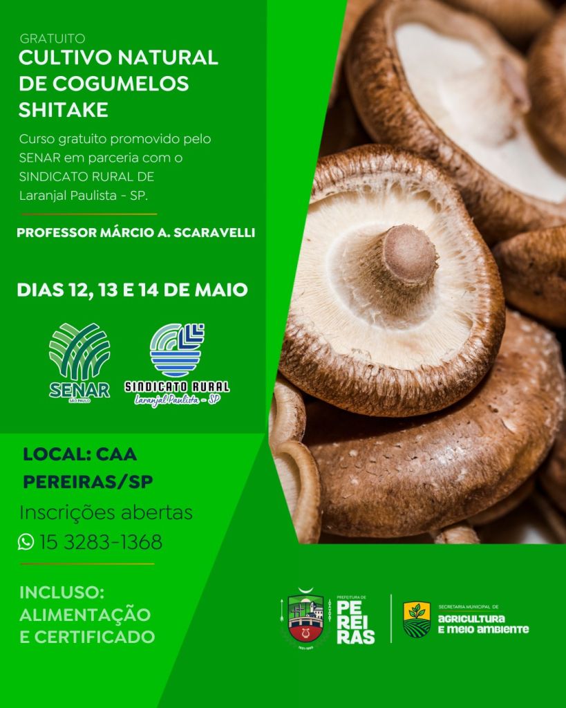 A Prefeitura de Pereiras, em parceria com o SENAR e o Sindicato Rural de Laranjal Paulista, convida você para participar de um curso especial sobre o cultivo natural de cogumelos shiitake! Uma ótima oportunidade para quem deseja aprender mais sobre produção sustentável e empreender no campo!