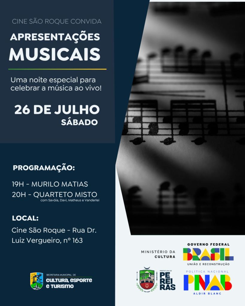 Convidamos a todos para uma noite especial. No dia 26 de julho, o Cine São Roque será palco de uma noite musical, venha celebrar a cultura de Pereiras e valorizar os talentos da nossa terra!