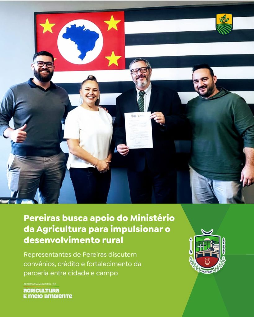 Em visita à Secretaria de Agricultura e Abastecimento do governo do Estado, representantes da administração municipal trataram de temas estratégicos para o desenvolvimento de Pereiras, como a ampliação de convênios, acesso a linhas de crédito e a obtenção de maquinários que atendam às necessidades do campo.