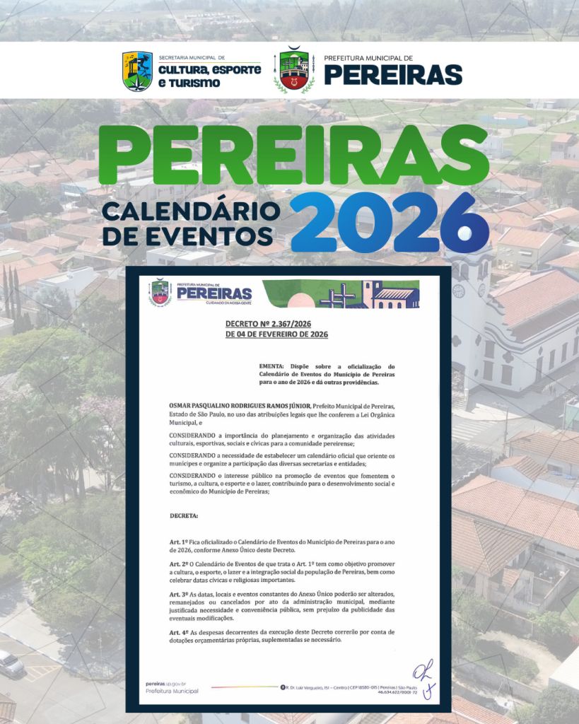 A Prefeitura Municipal de Pereiras publicou, por meio de decreto, o Calendário Oficial de Eventos para o ano de 2026. O documento reúne as principais atividades culturais, esportivas, sociais e cívicas previstas para serem realizadas no município ao longo do ano.