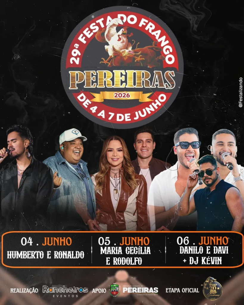 A realização é da Rancheiros Eventos, com apoio da Prefeitura Municipal de Pereiras.