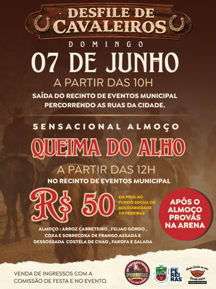 A programação da 29ª Festa do Frango e Peão Boiadeiro de Pereiras contará, no dia 7 de junho, com a realização do tradicional Desfile de Cavaleiros e do almoço beneficente “Queima do Alho”.