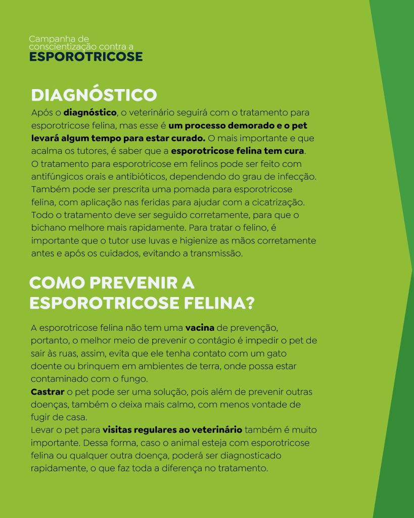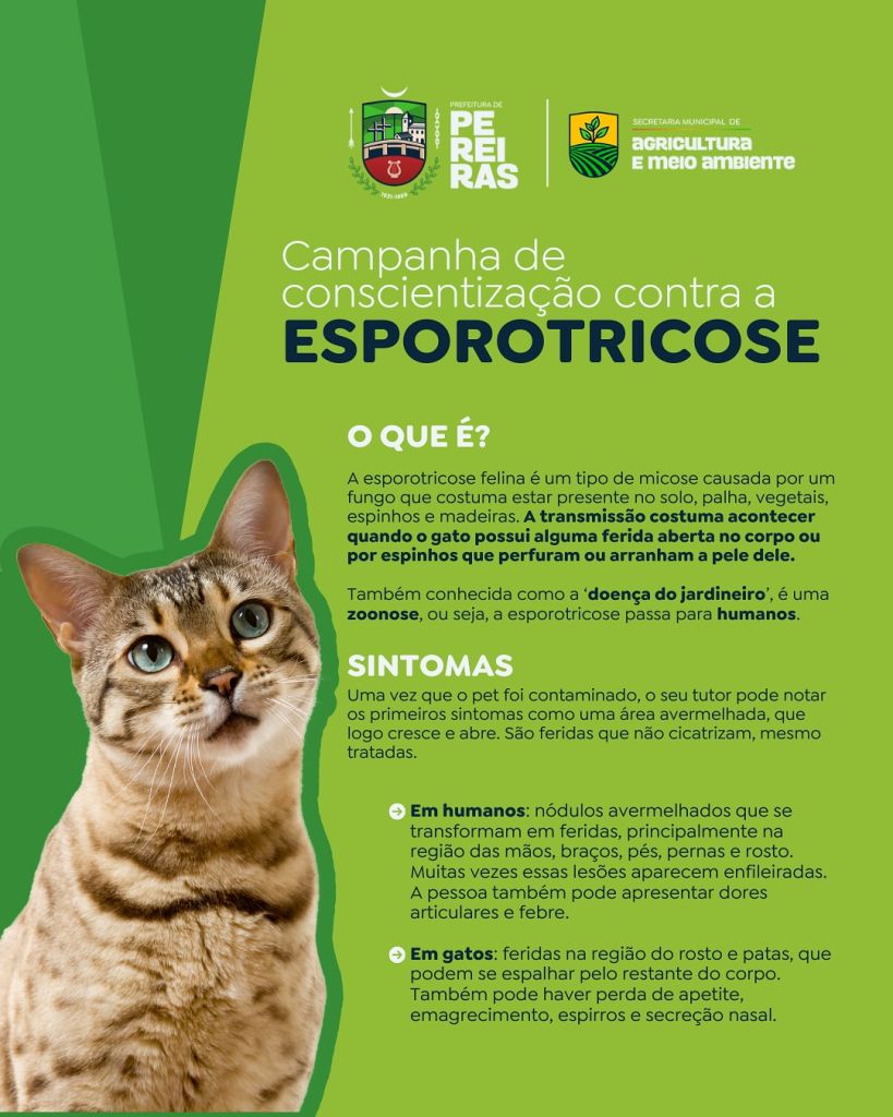 A esporotricose é uma infecção causada por um fungo presente no solo, que pode afetar animais e humanos. Nos gatos, os sintomas incluem feridas que não cicatrizam, secreções e inchaços. Já nos humanos, pode causar lesões na pele, principalmente após arranhões ou mordidas de um animal infectado.